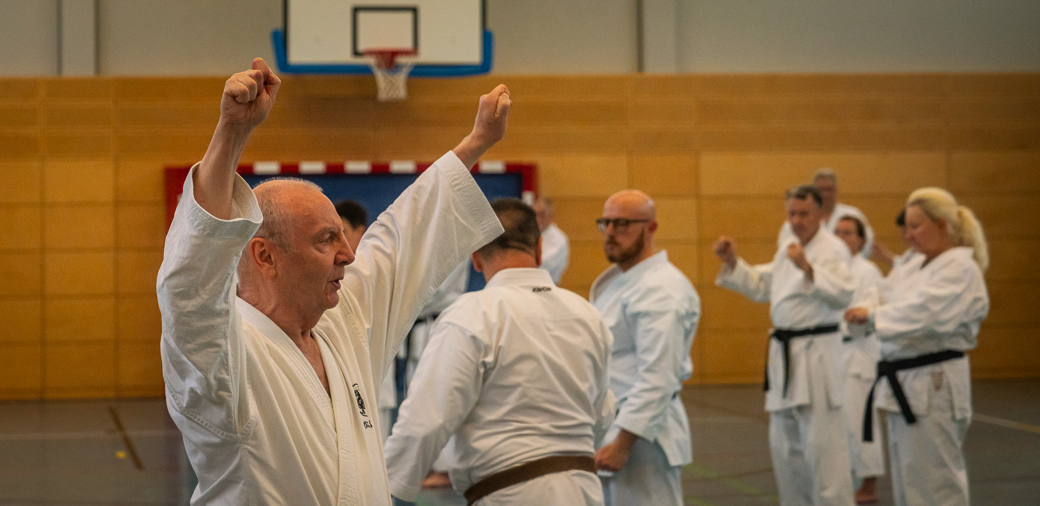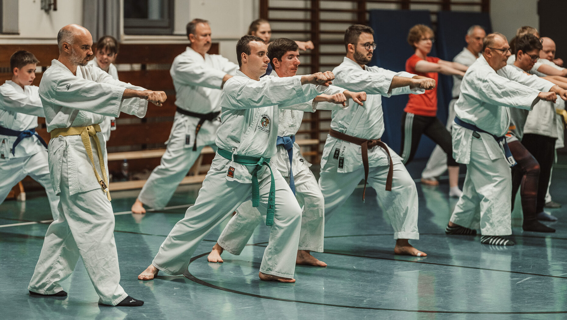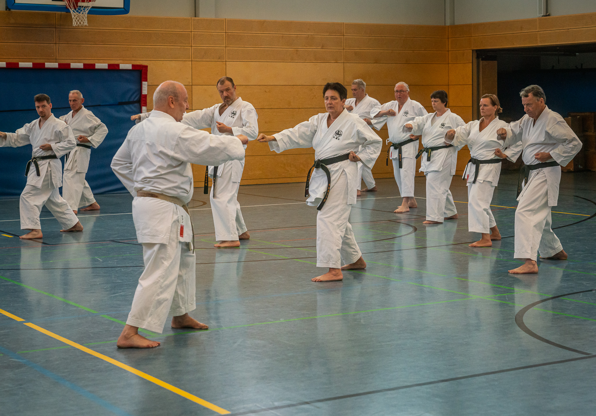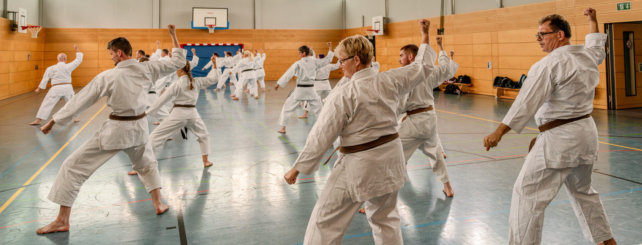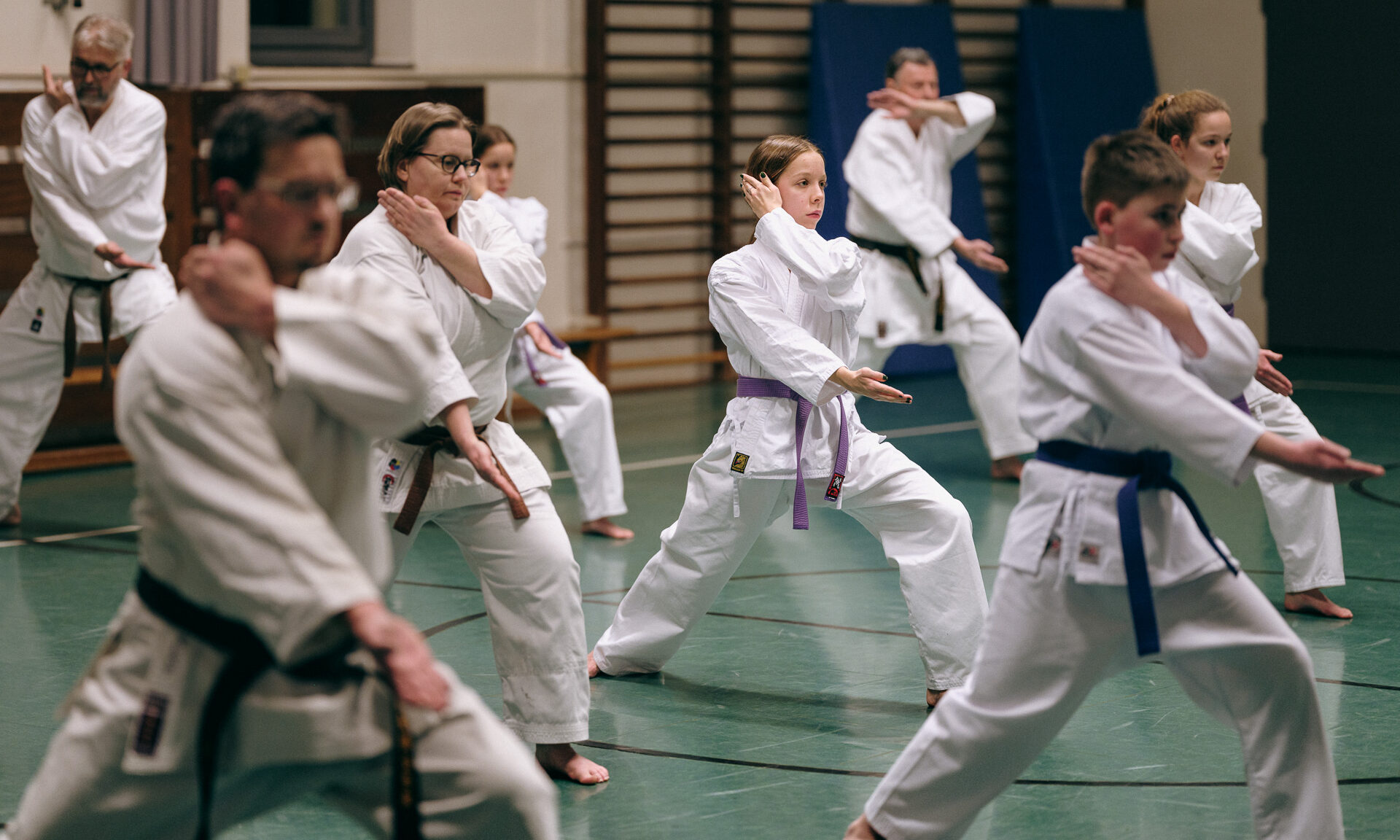 Alle trainieren Manji Uke im Karate Grundlagentraining – ohne Hacken sondern mit Harmonie.