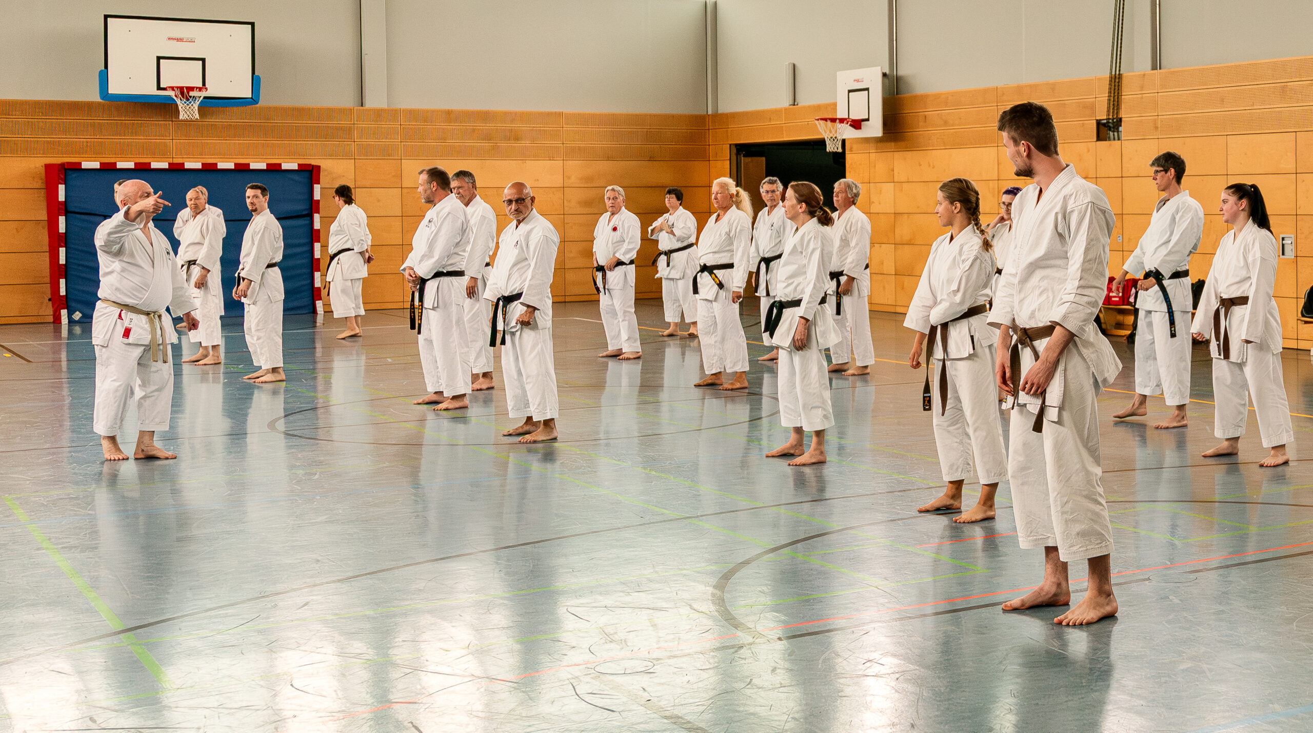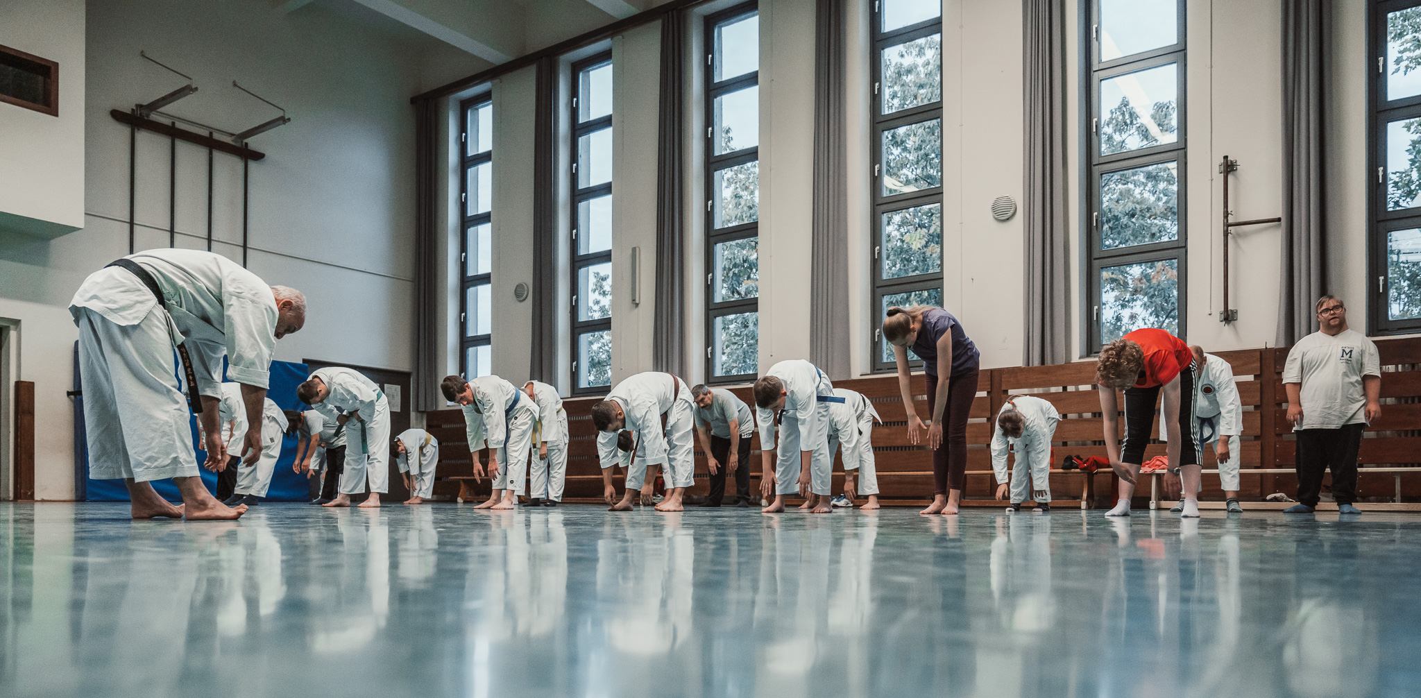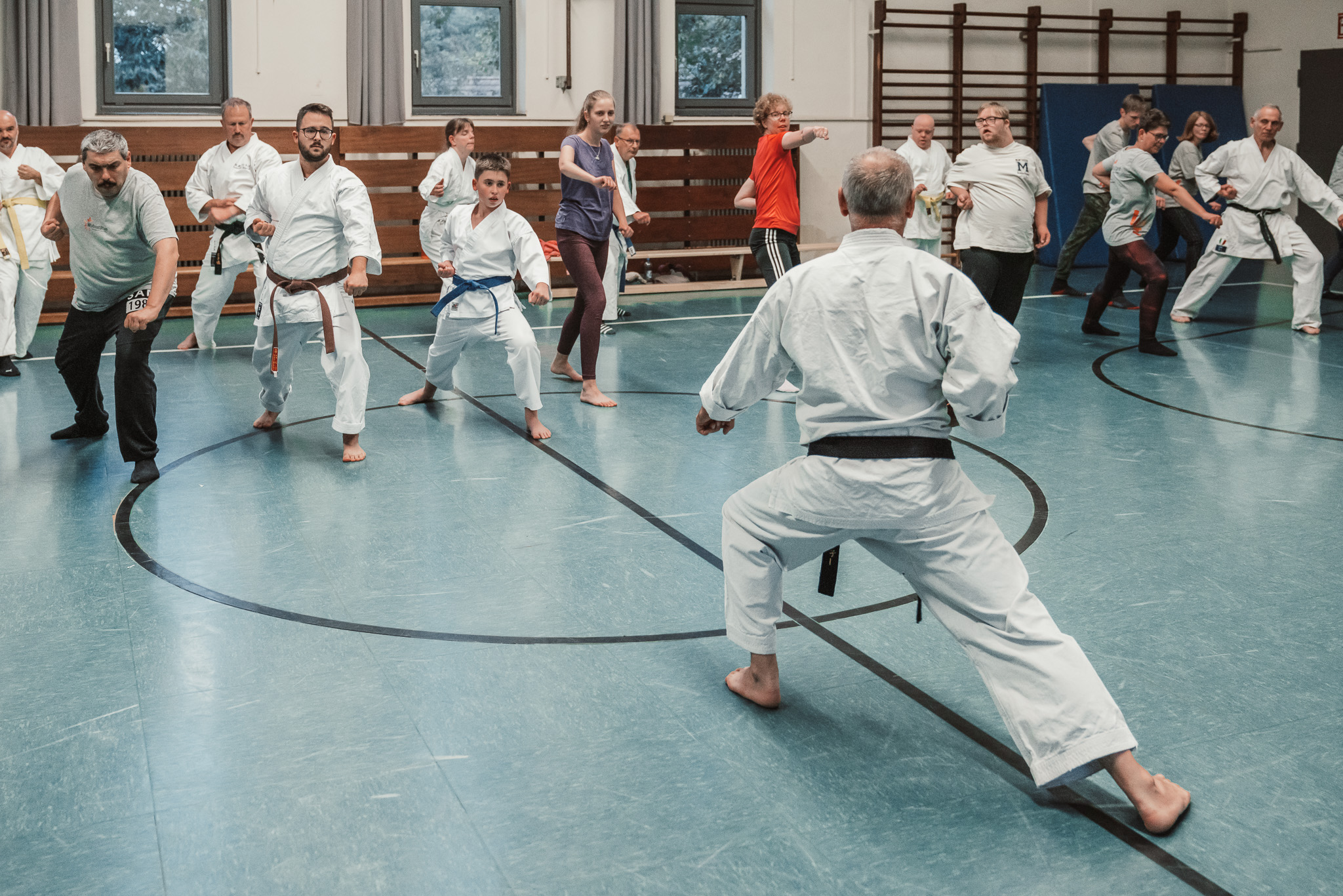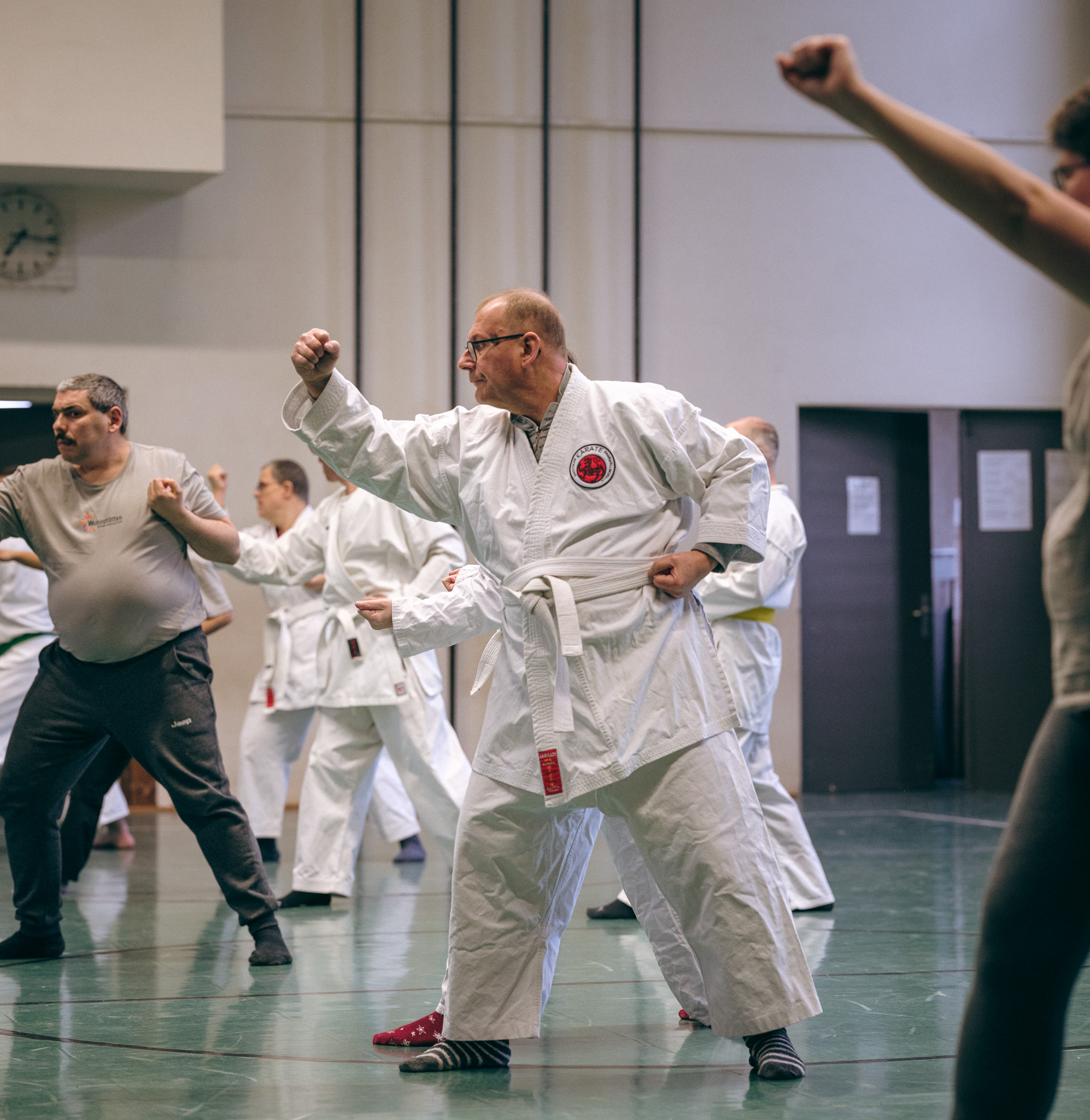 Alle trainieren Manji Uke im Karate Grundlagentraining – ohne Hacken sondern mit Harmonie.