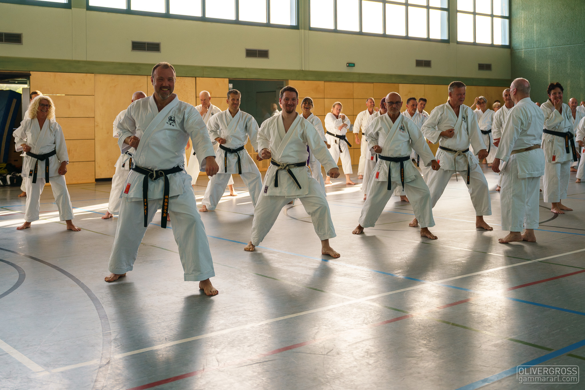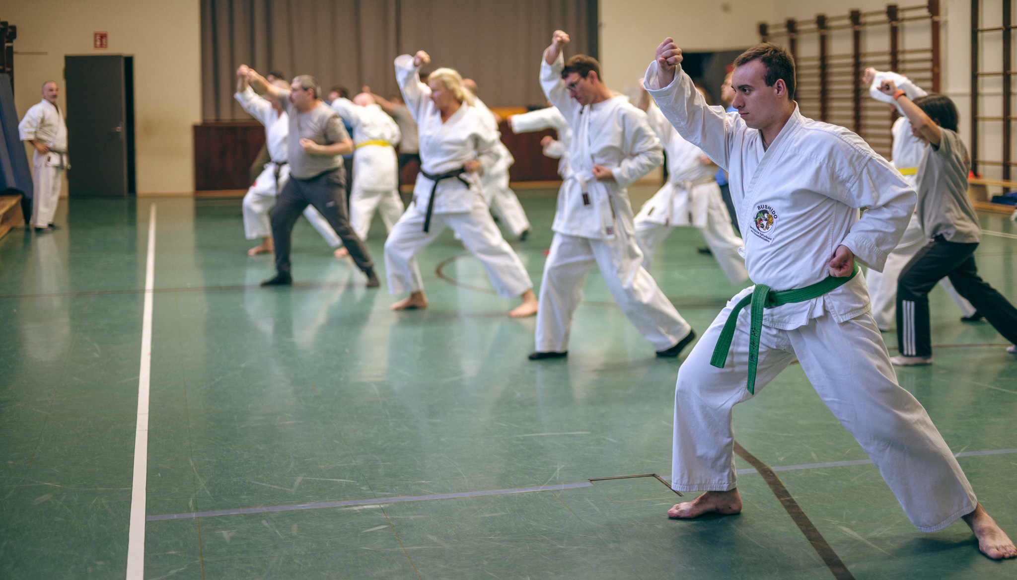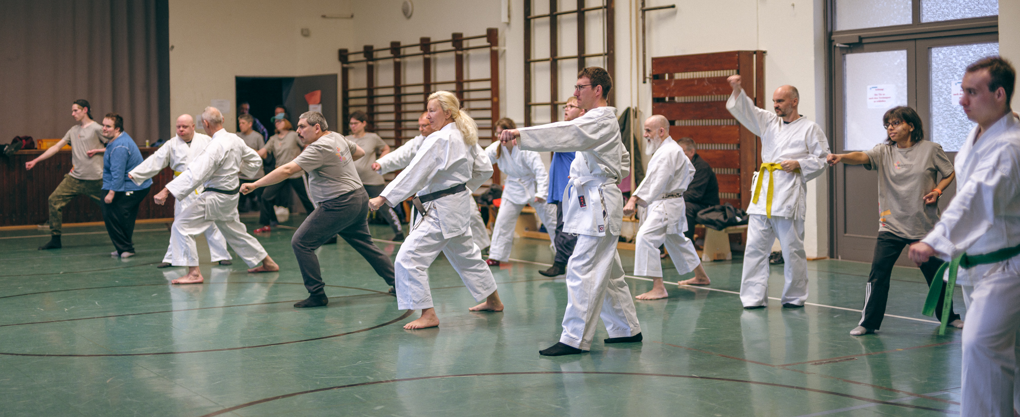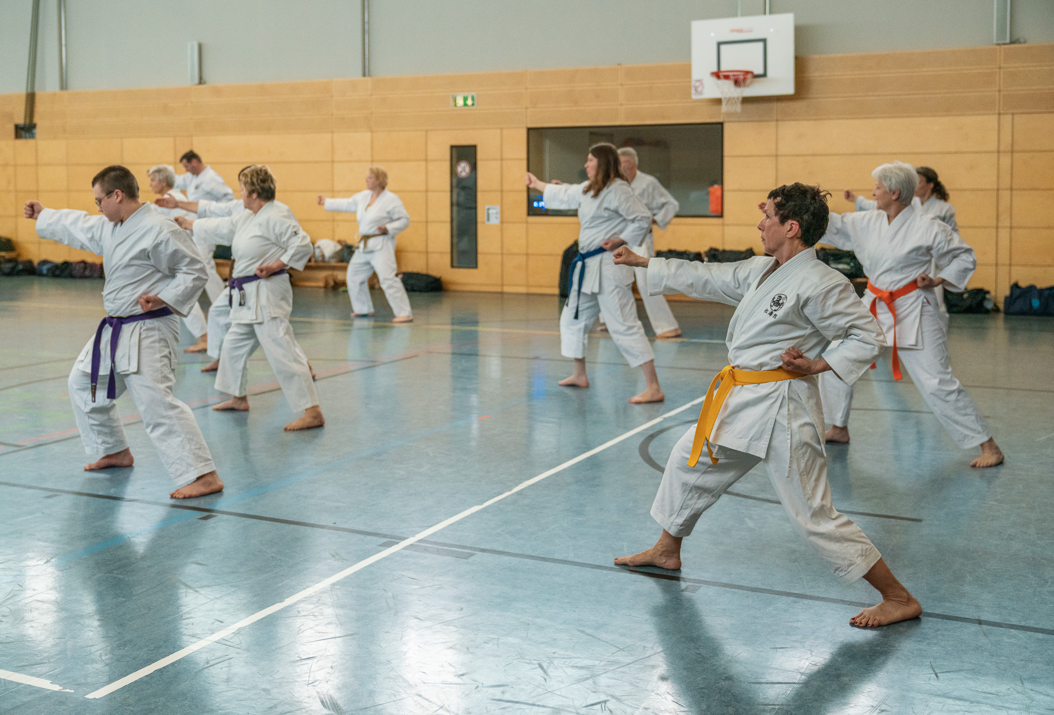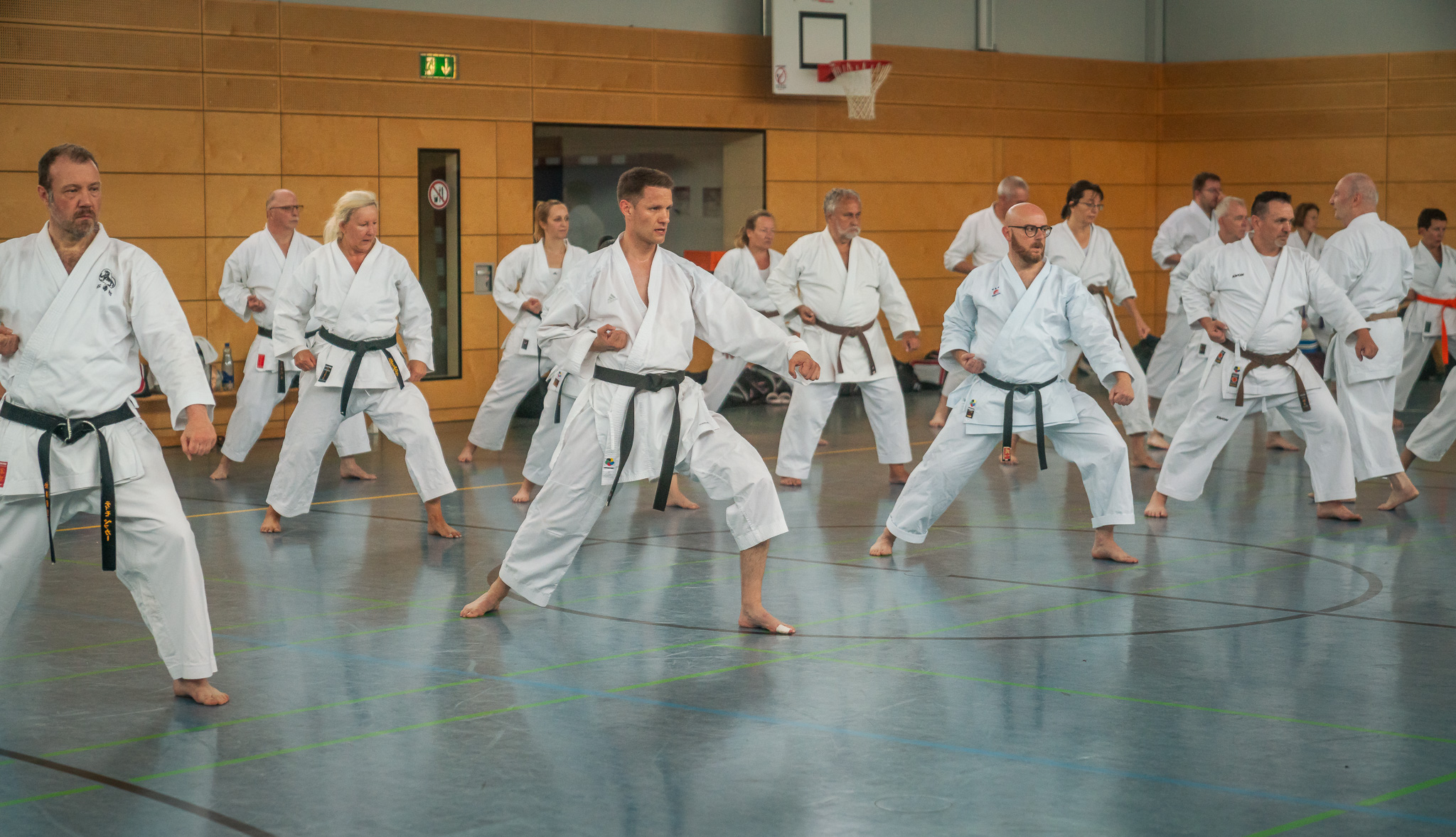 Alle trainieren Manji Uke im Karate Grundlagentraining – ohne Hacken sondern mit Harmonie.