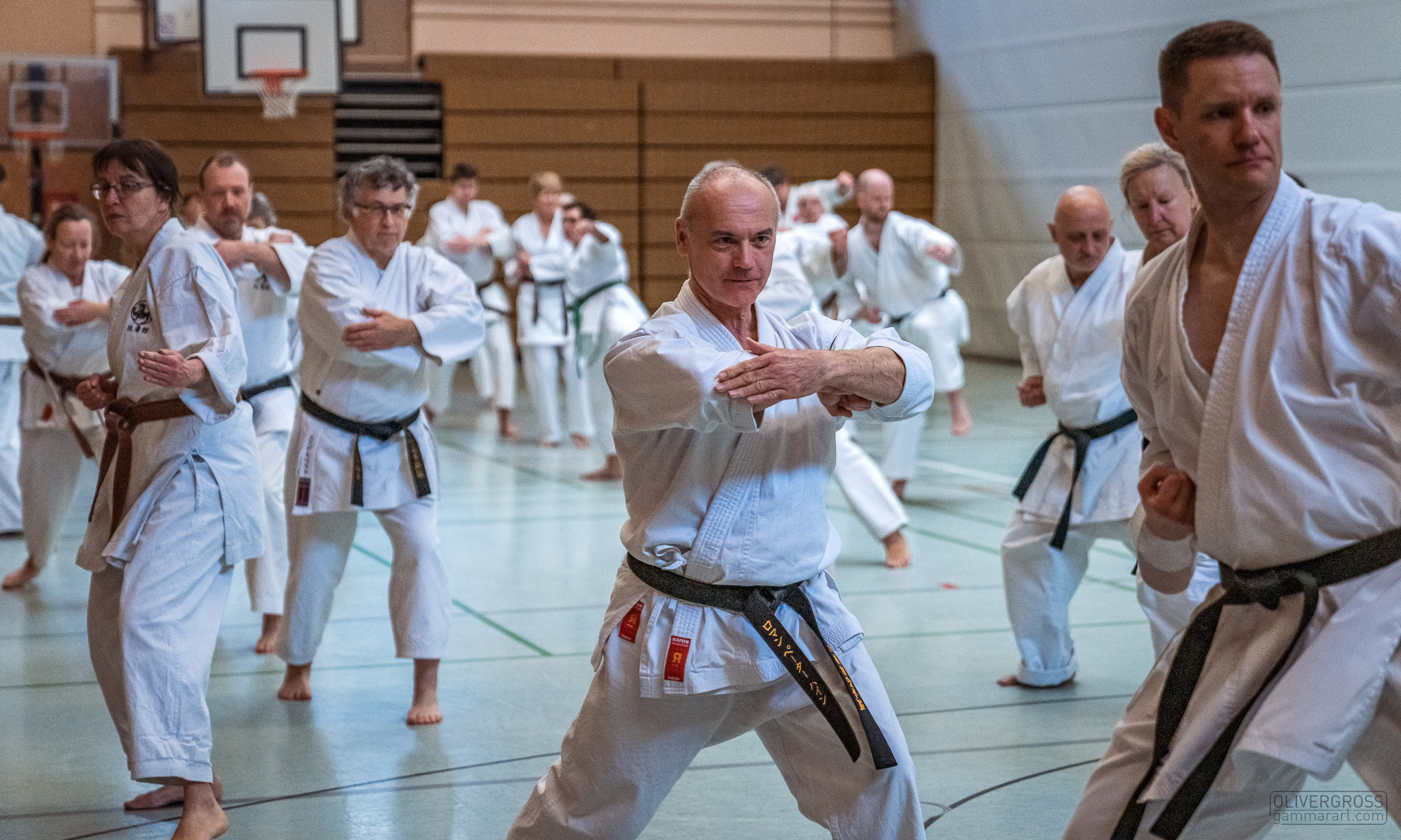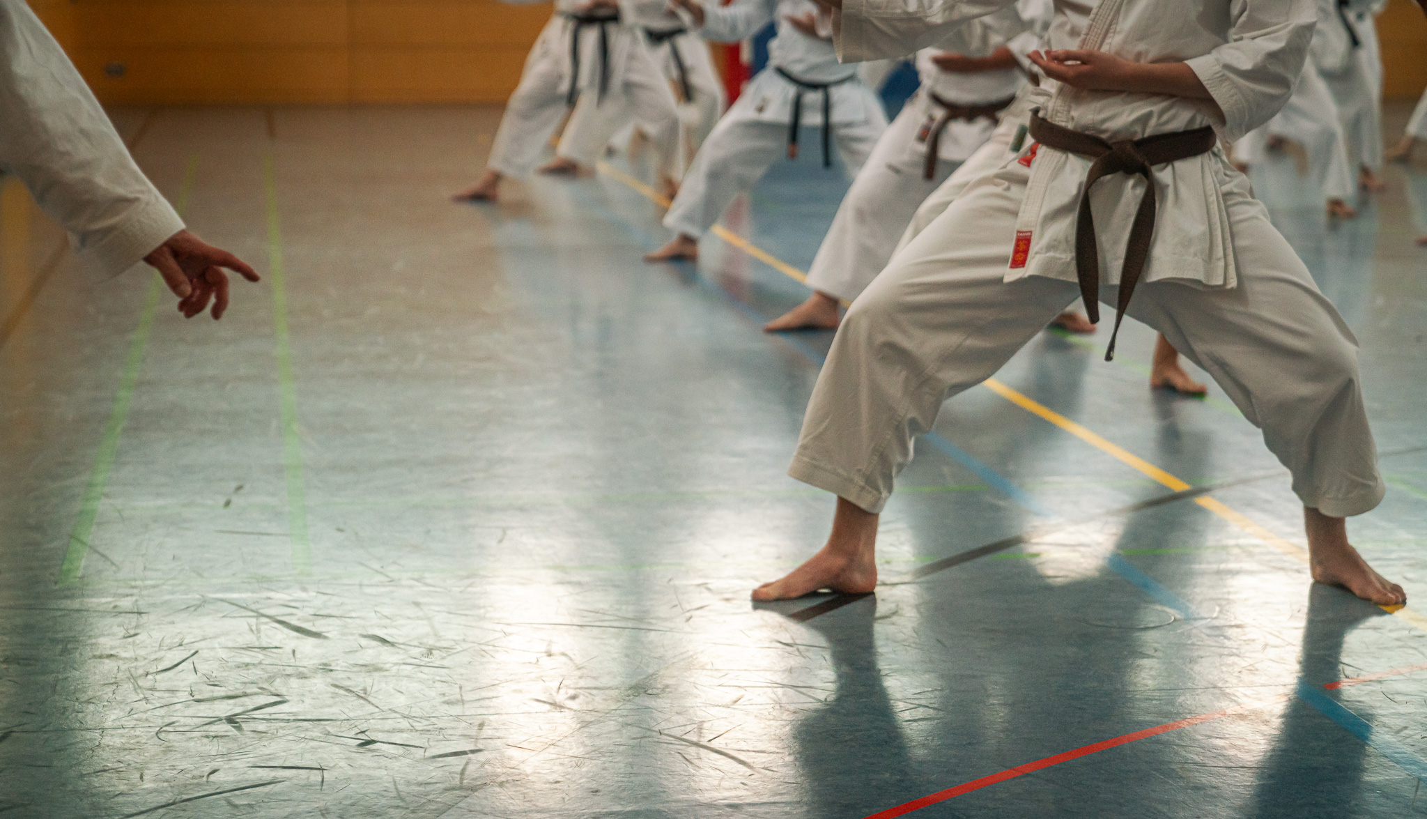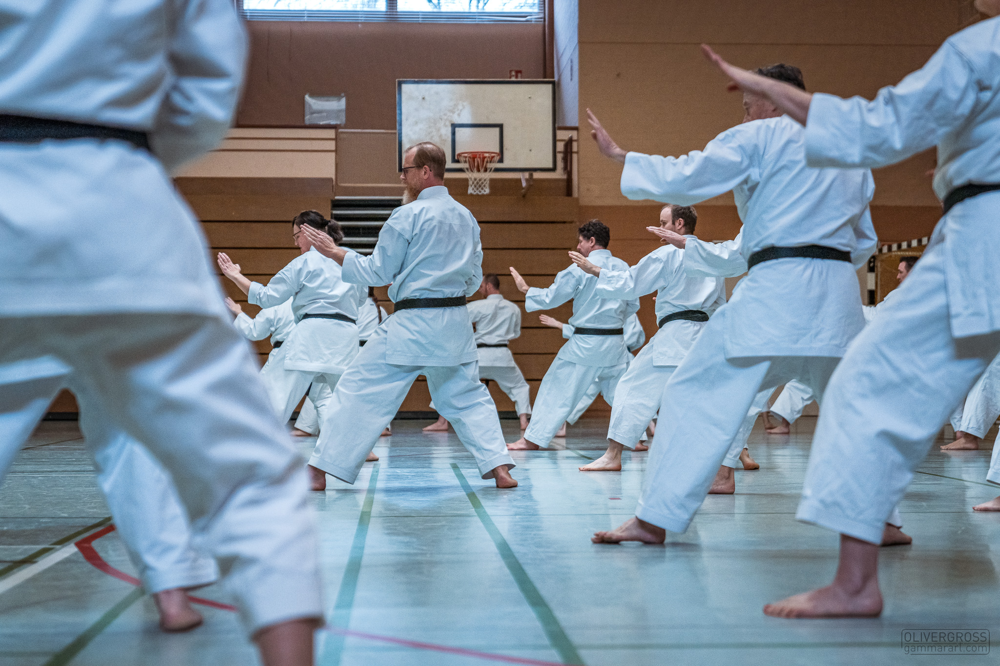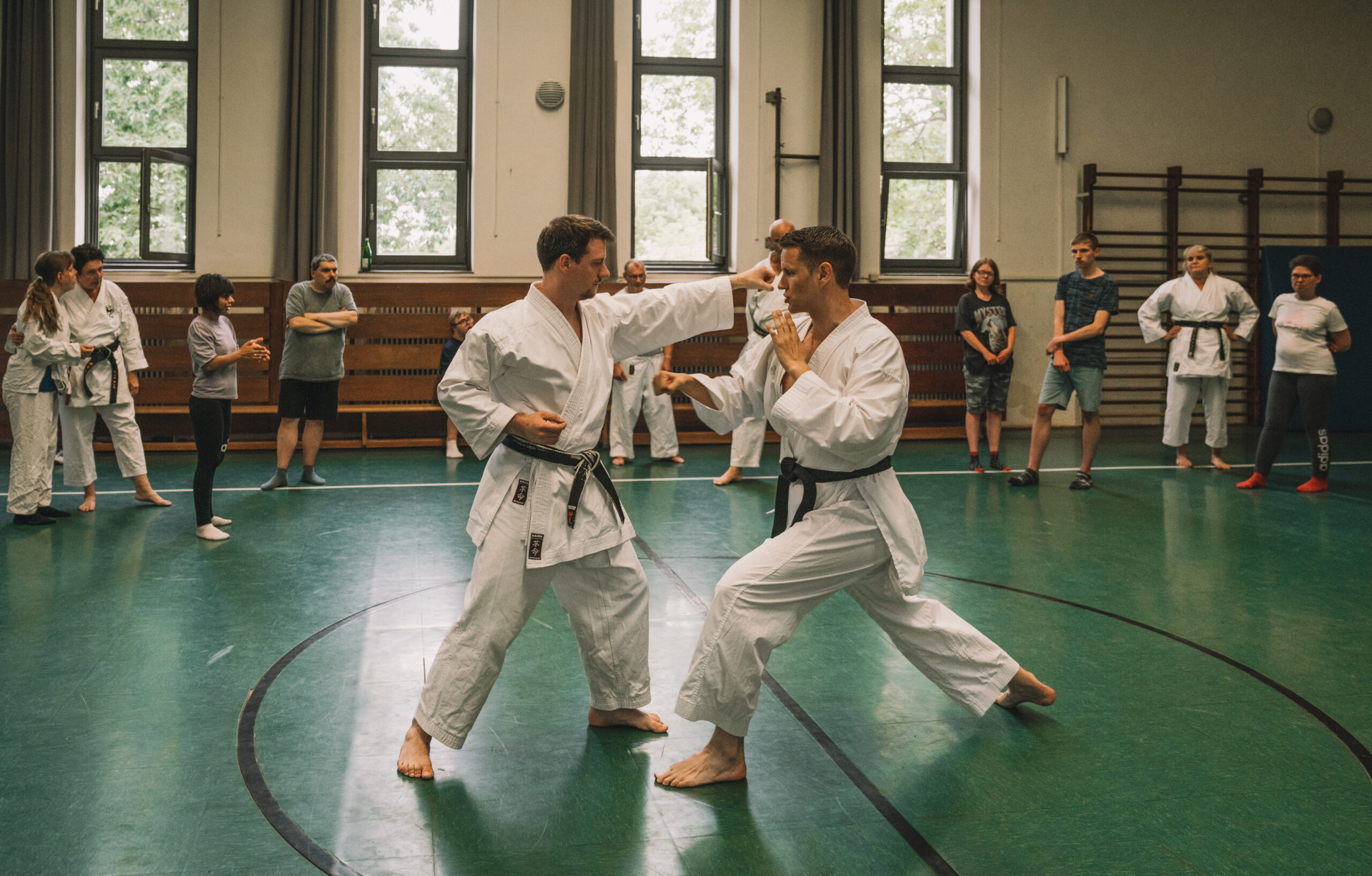 Alle trainieren Manji Uke im Karate Grundlagentraining – ohne Hacken sondern mit Harmonie.