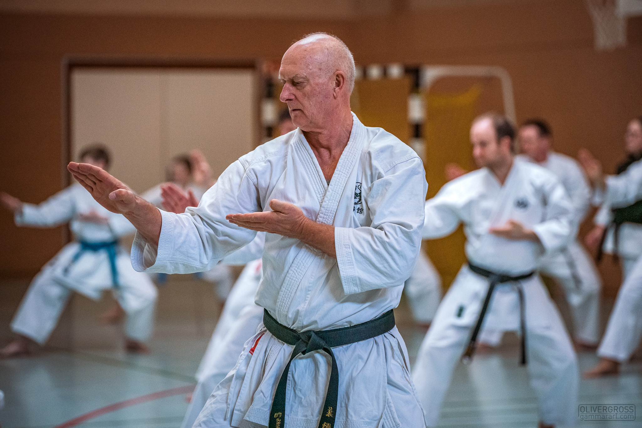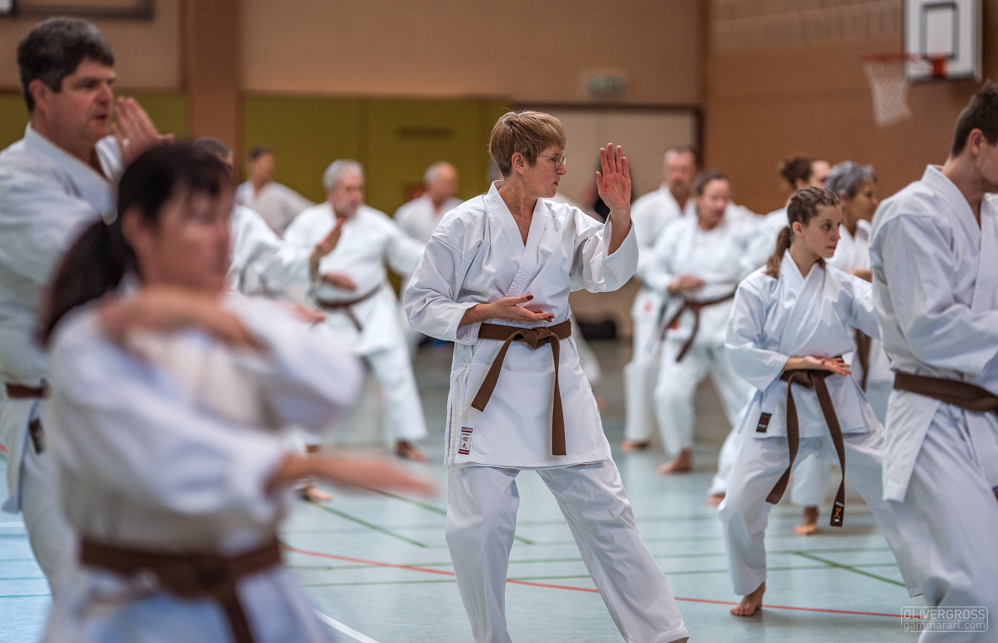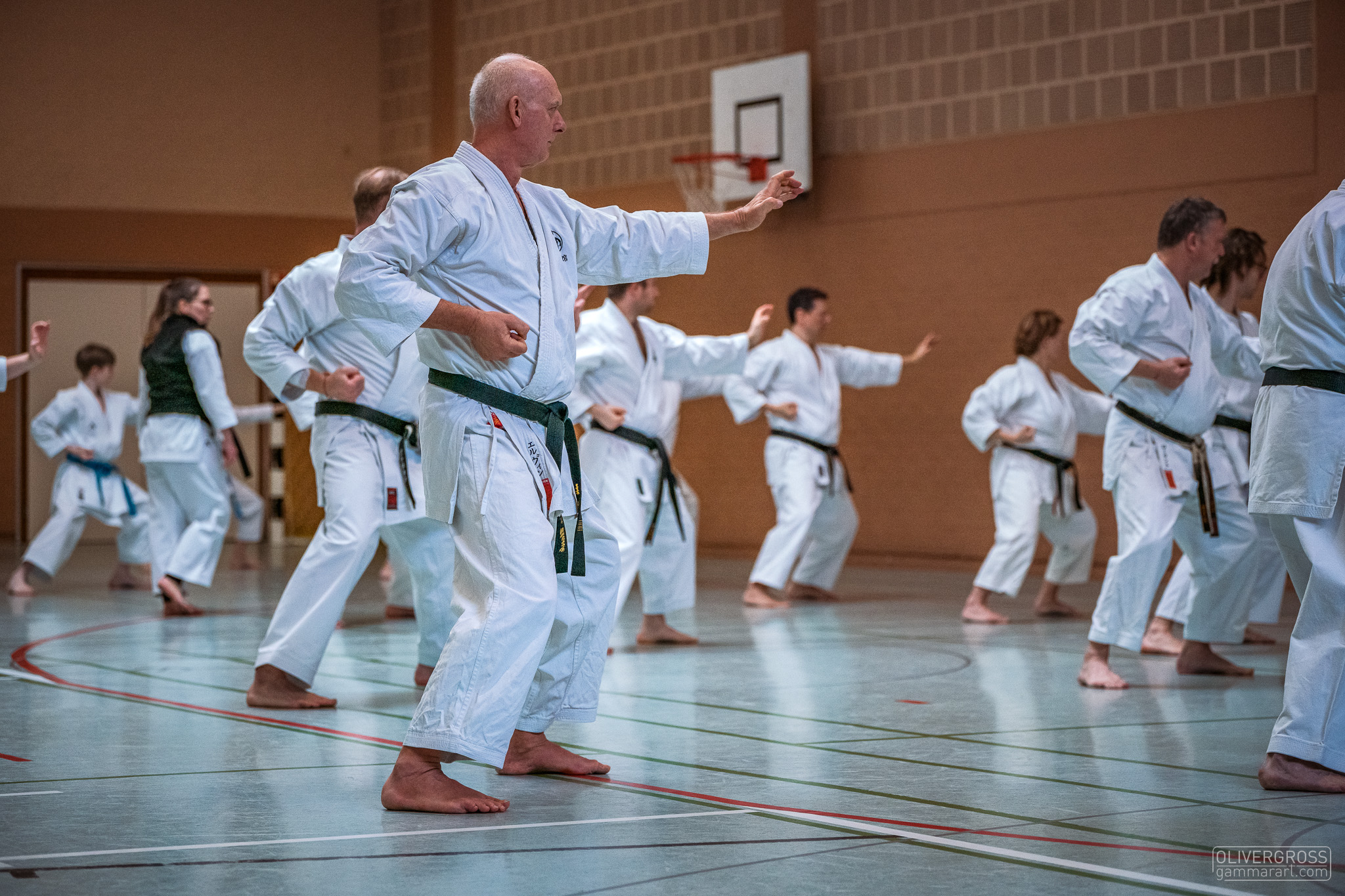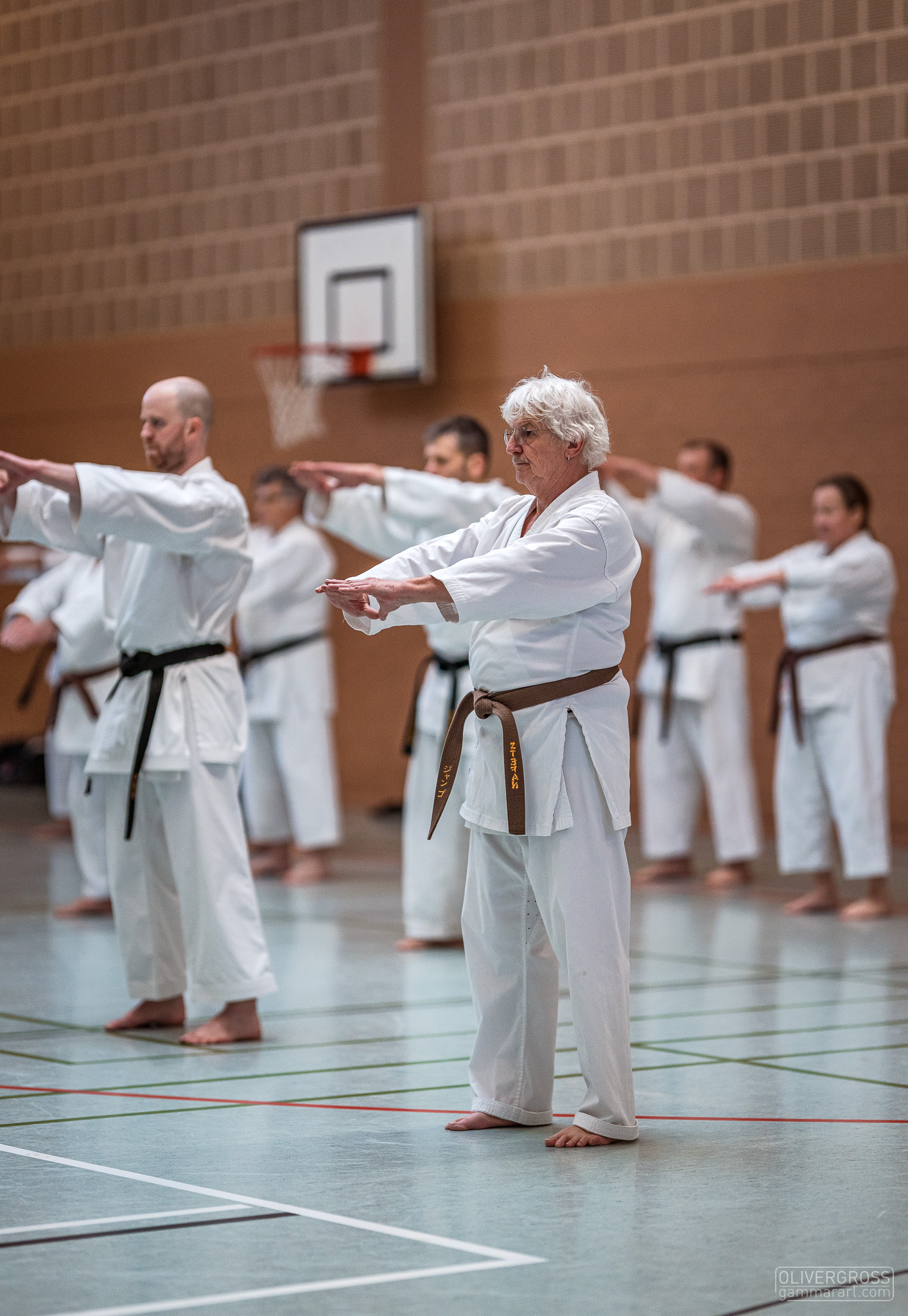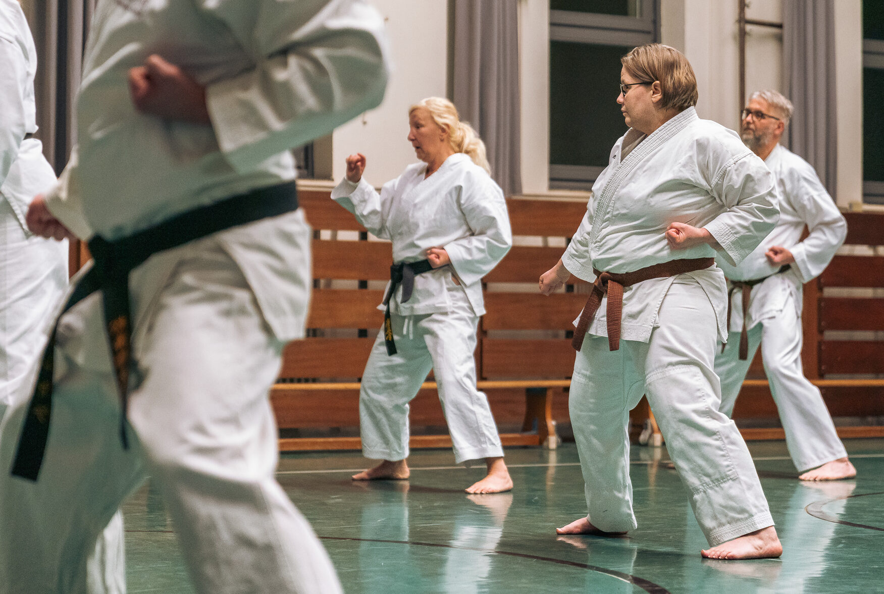 Alle trainieren Manji Uke im Karate Grundlagentraining – ohne Hacken sondern mit Harmonie.