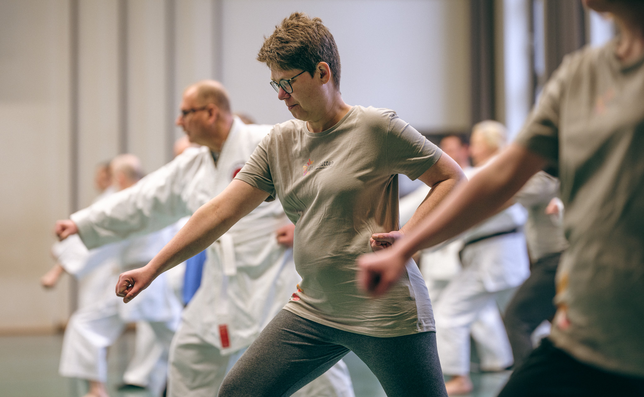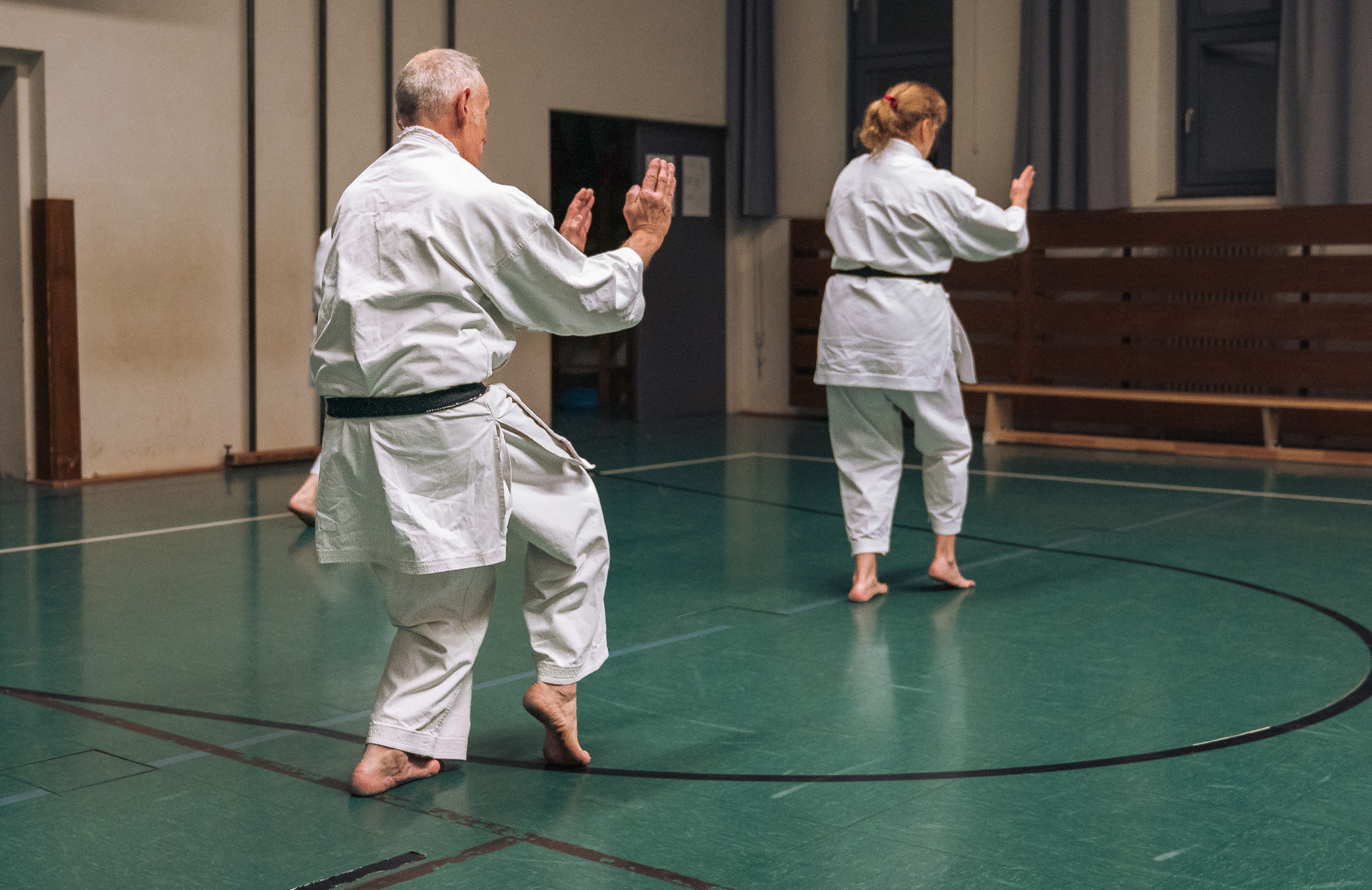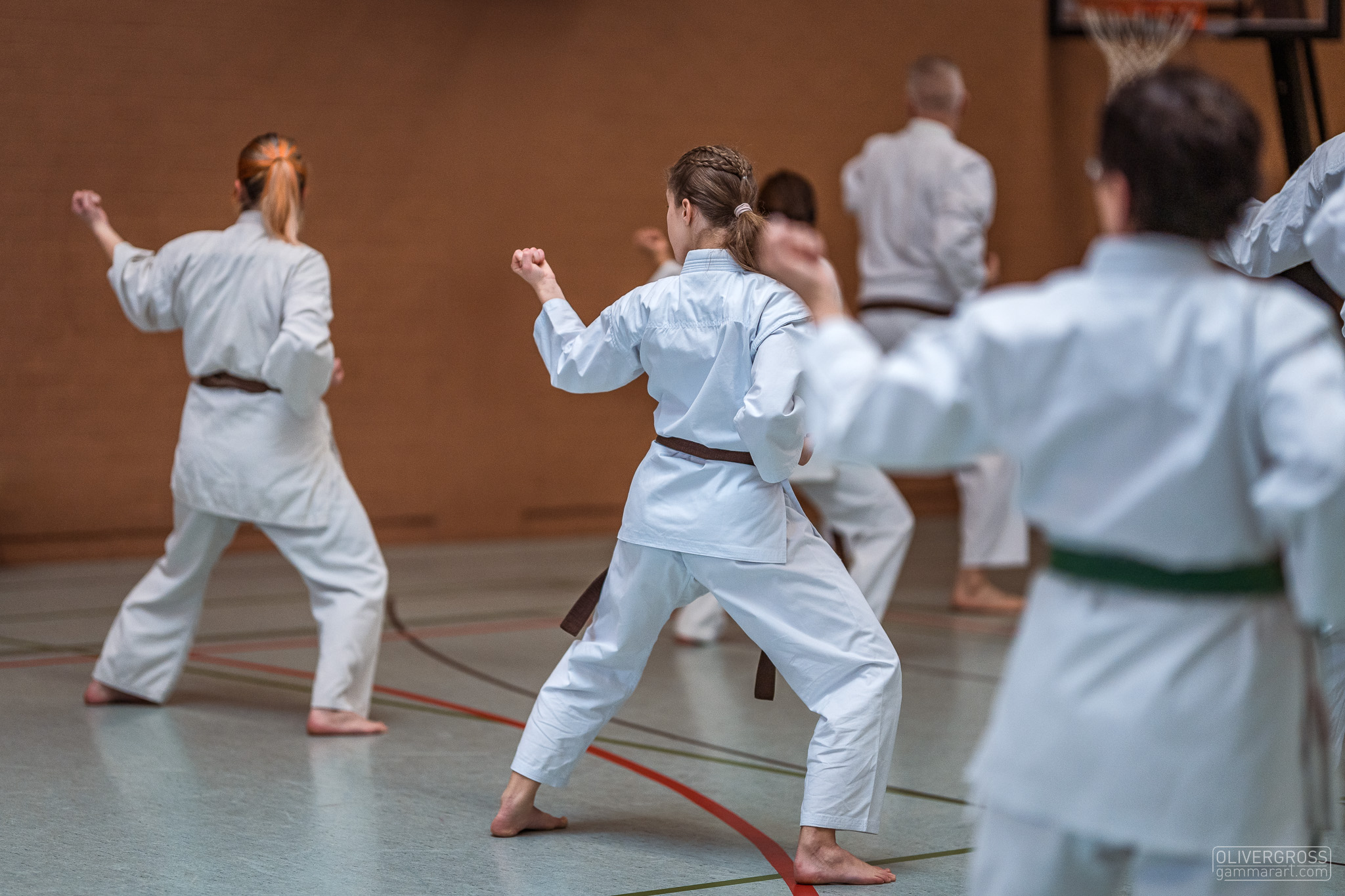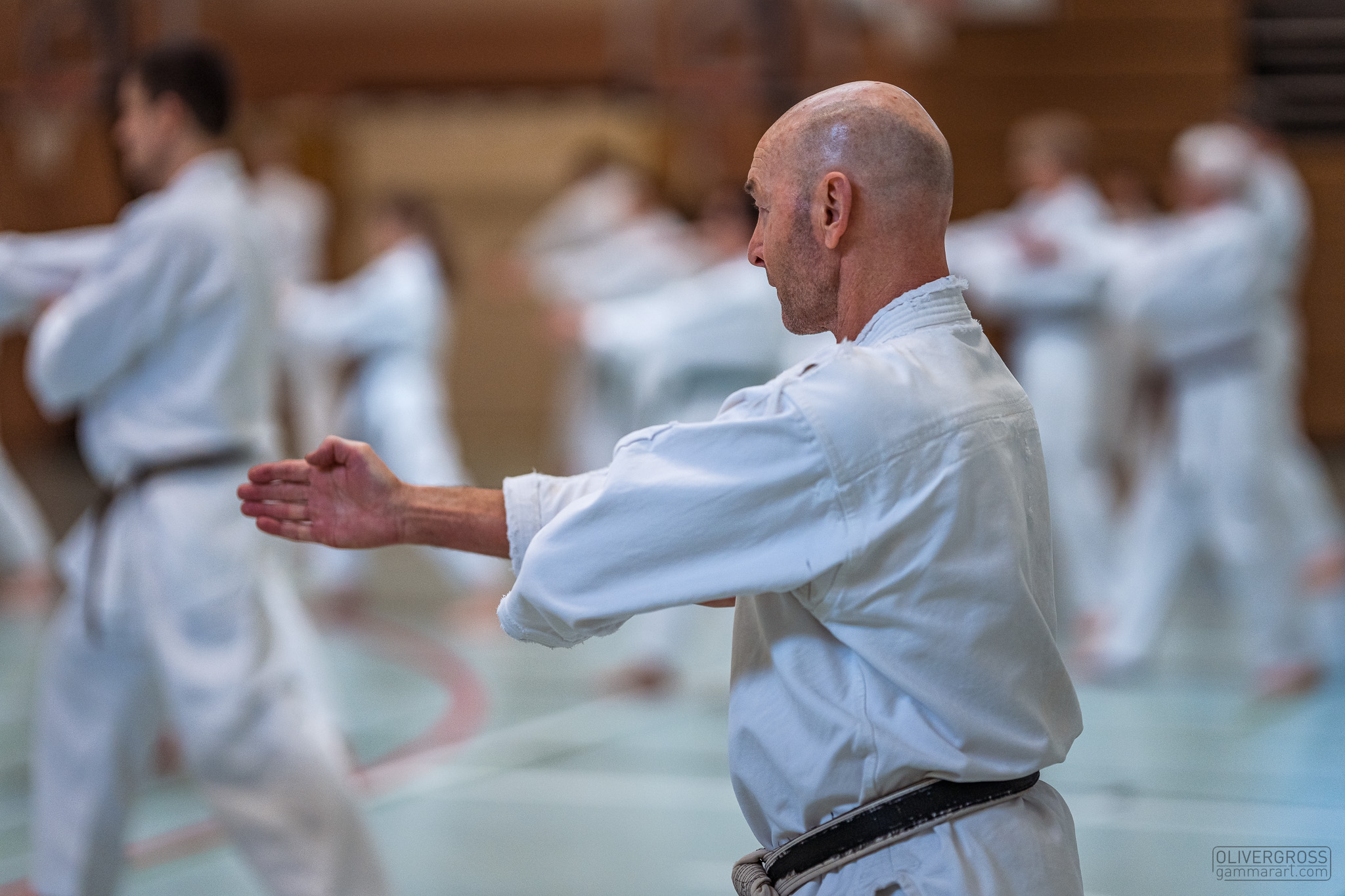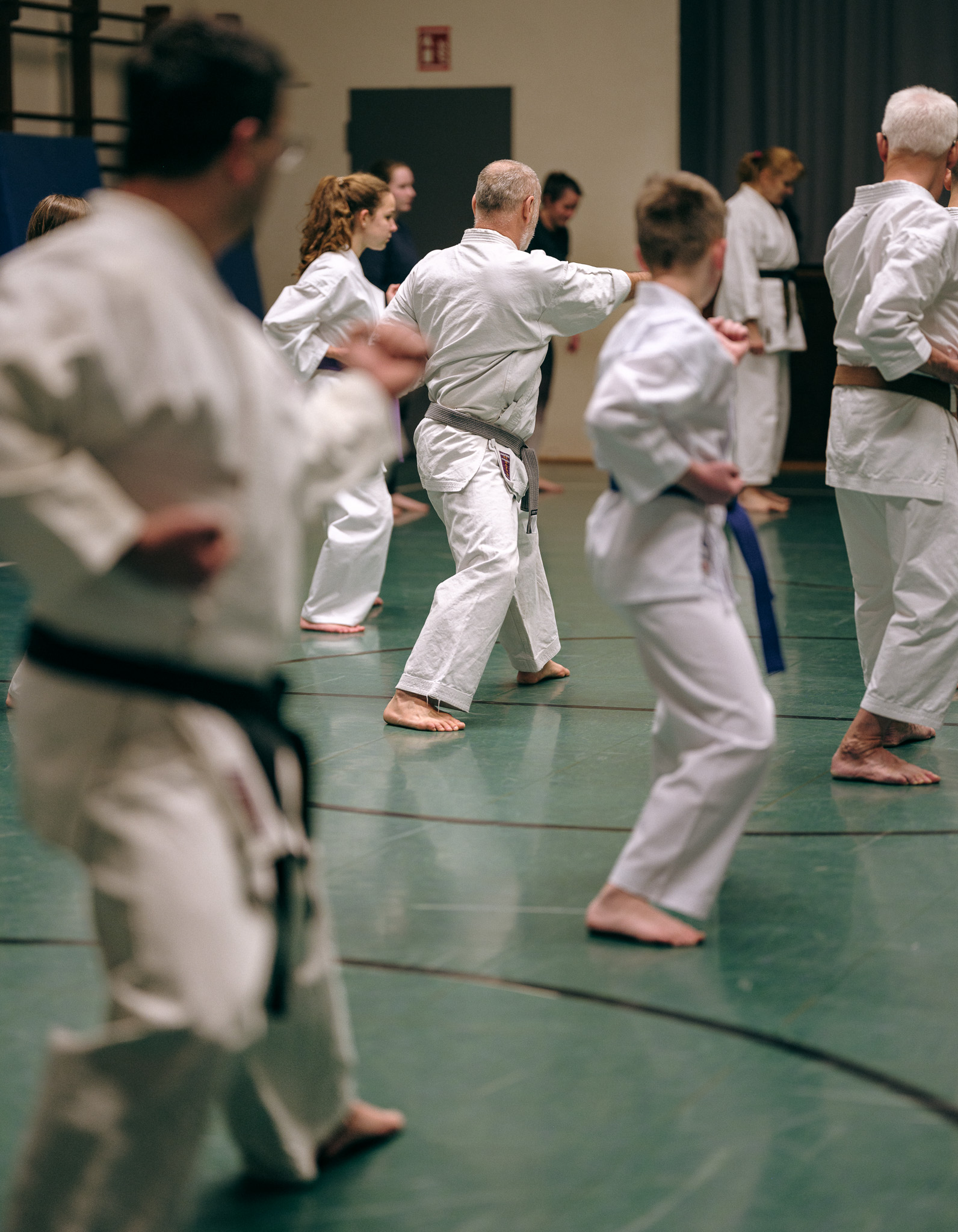 Alle trainieren Manji Uke im Karate Grundlagentraining – ohne Hacken sondern mit Harmonie.