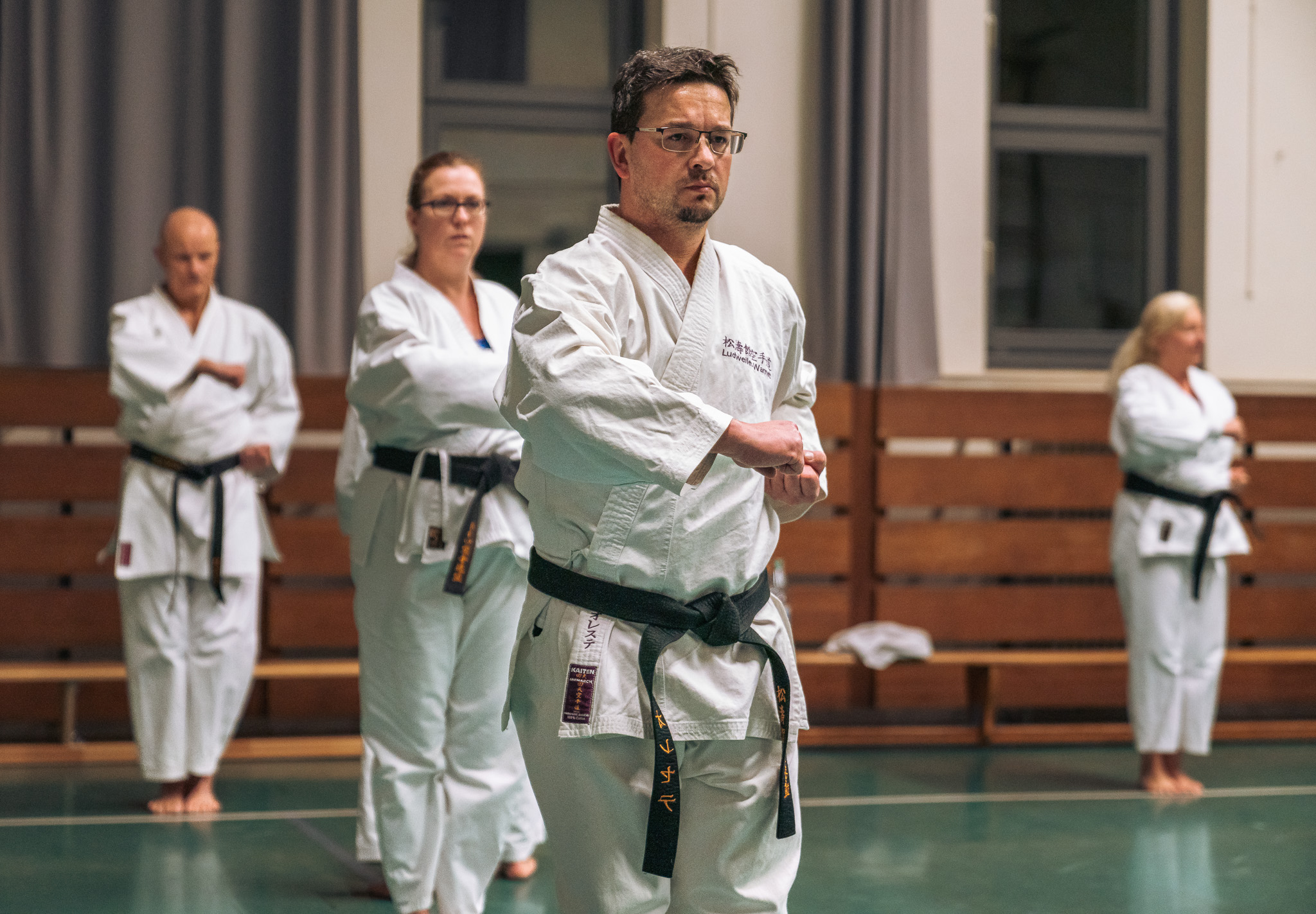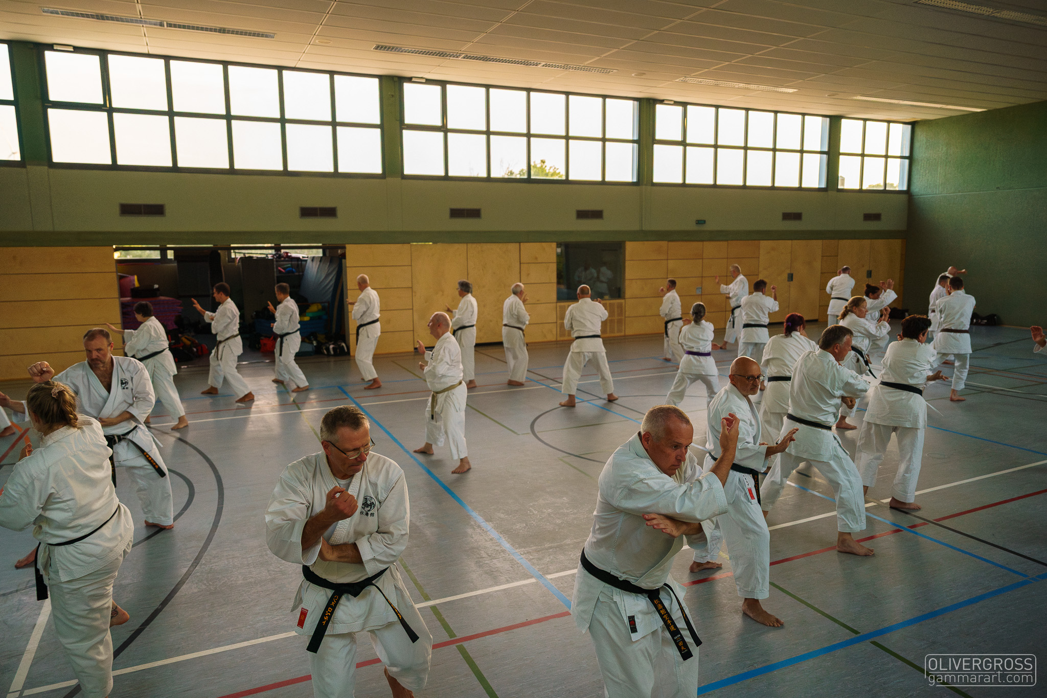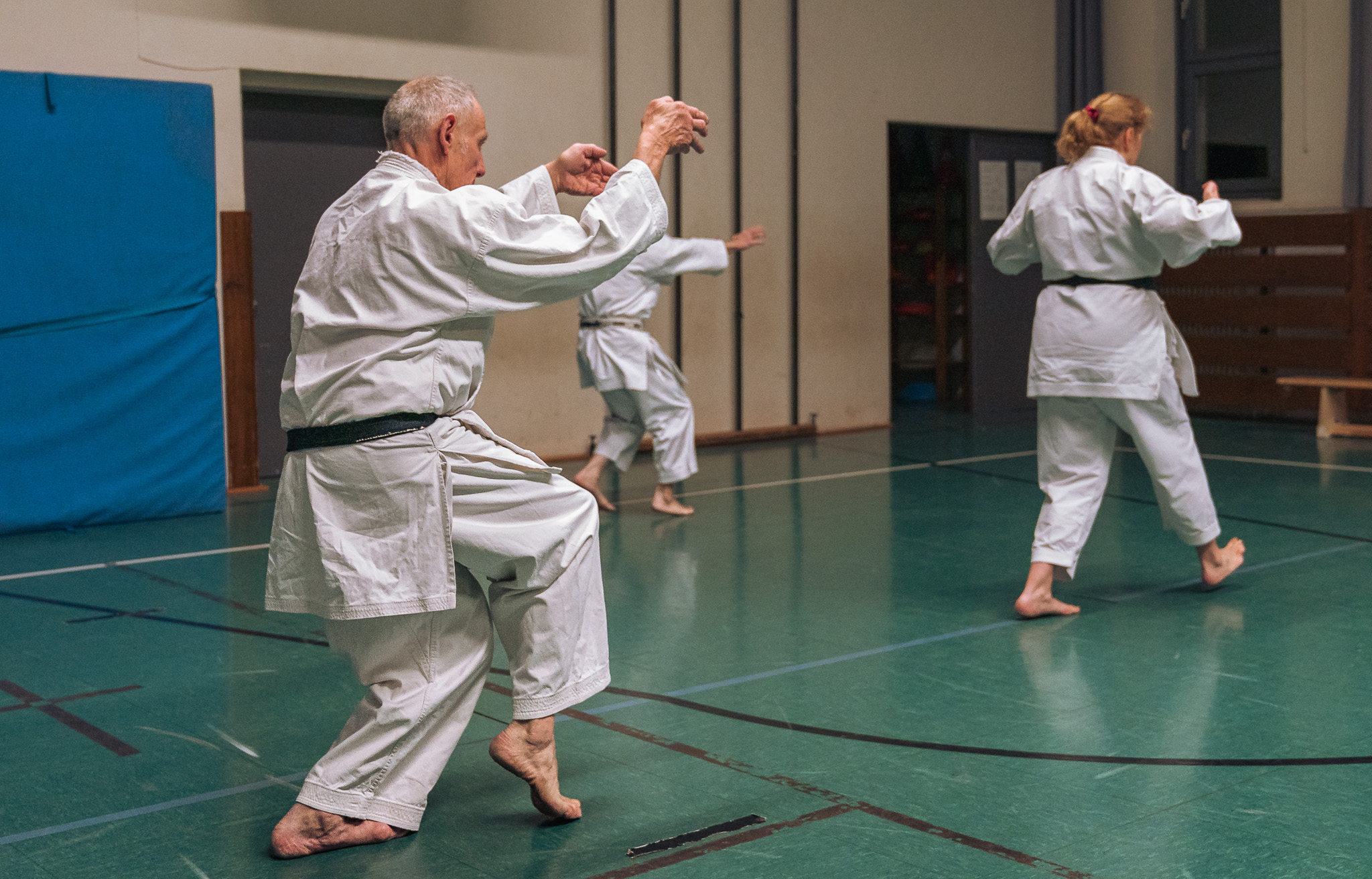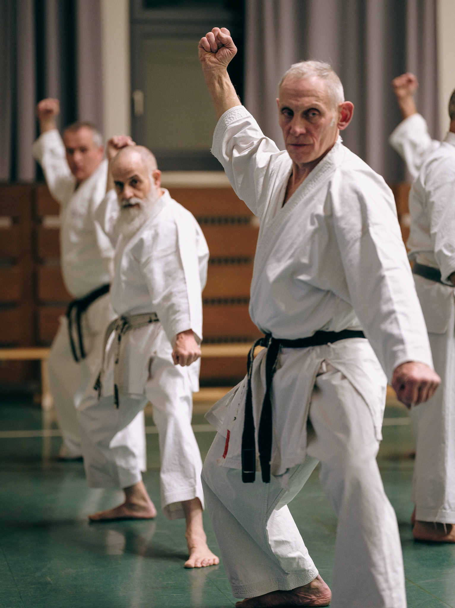 Alle trainieren Manji Uke im Karate Grundlagentraining – ohne Hacken sondern mit Harmonie.