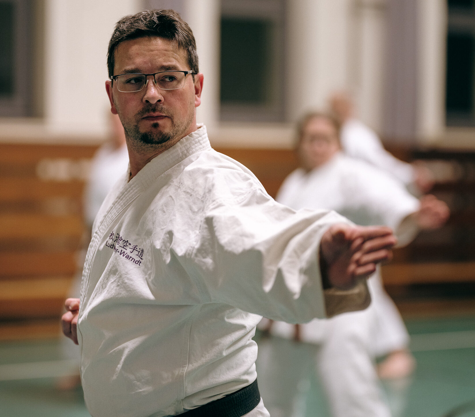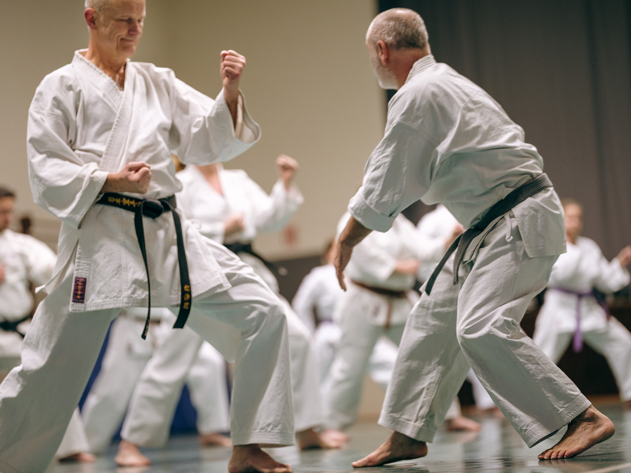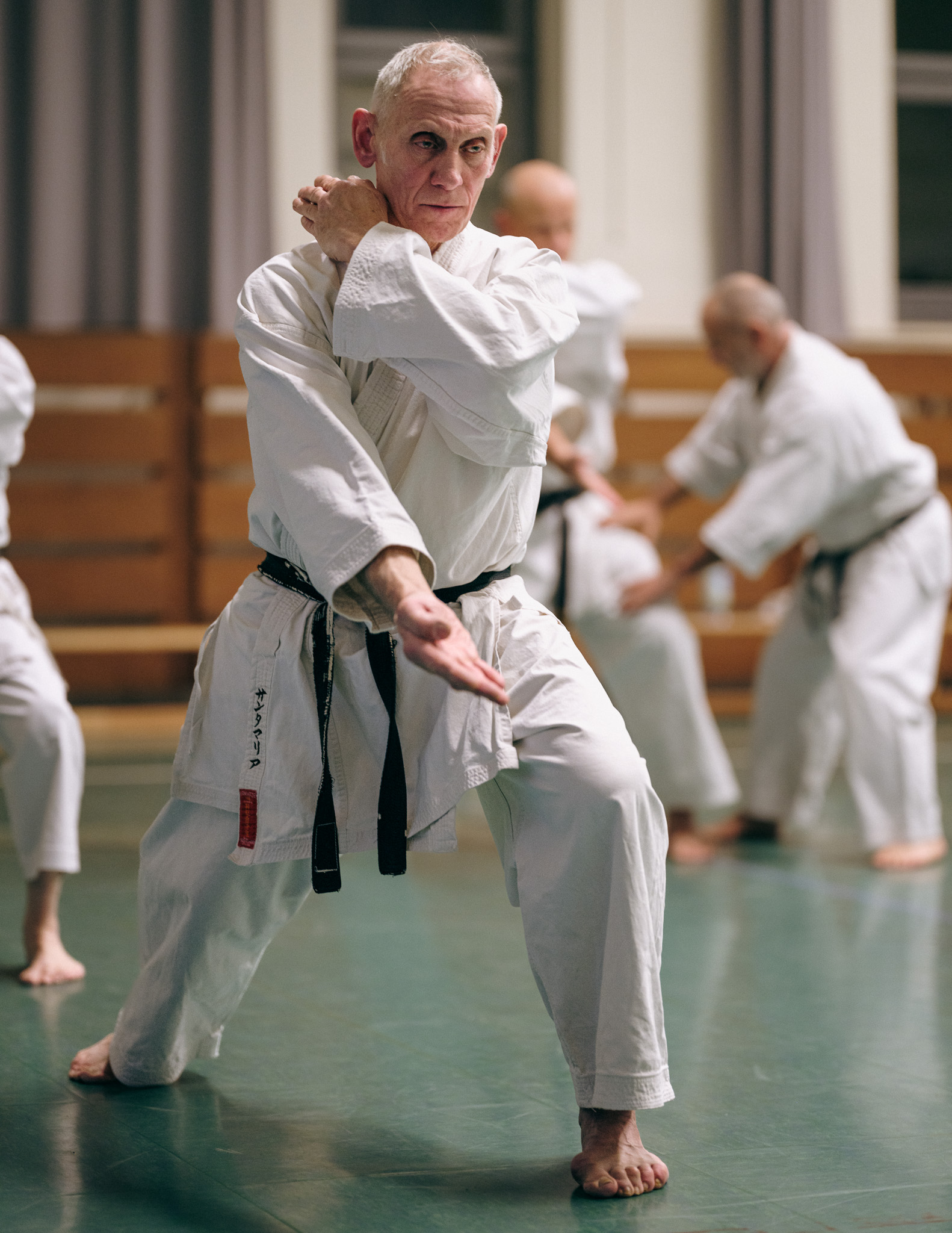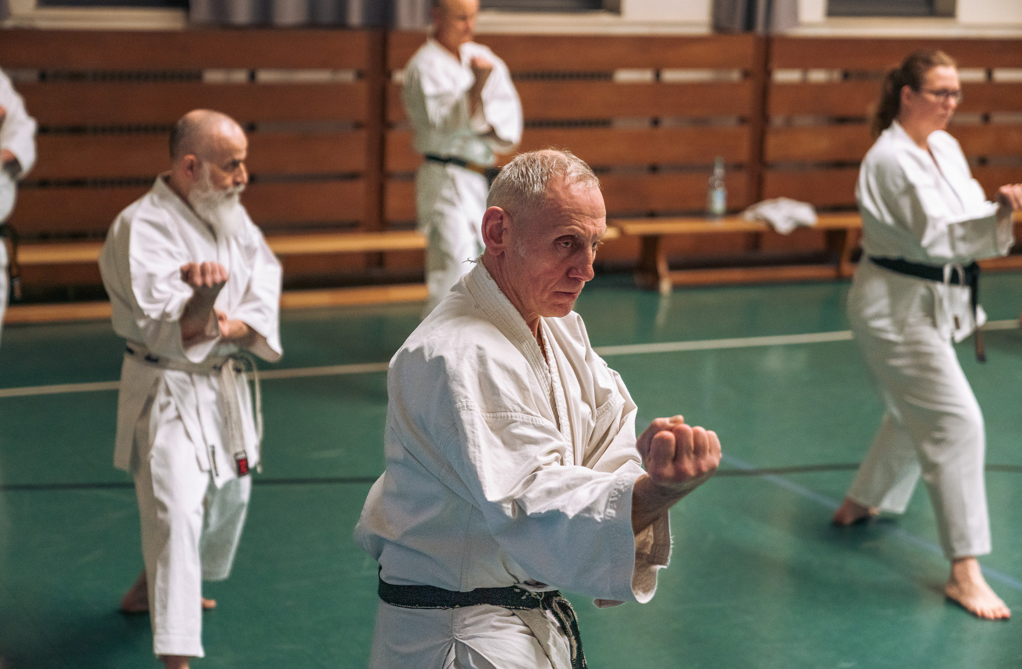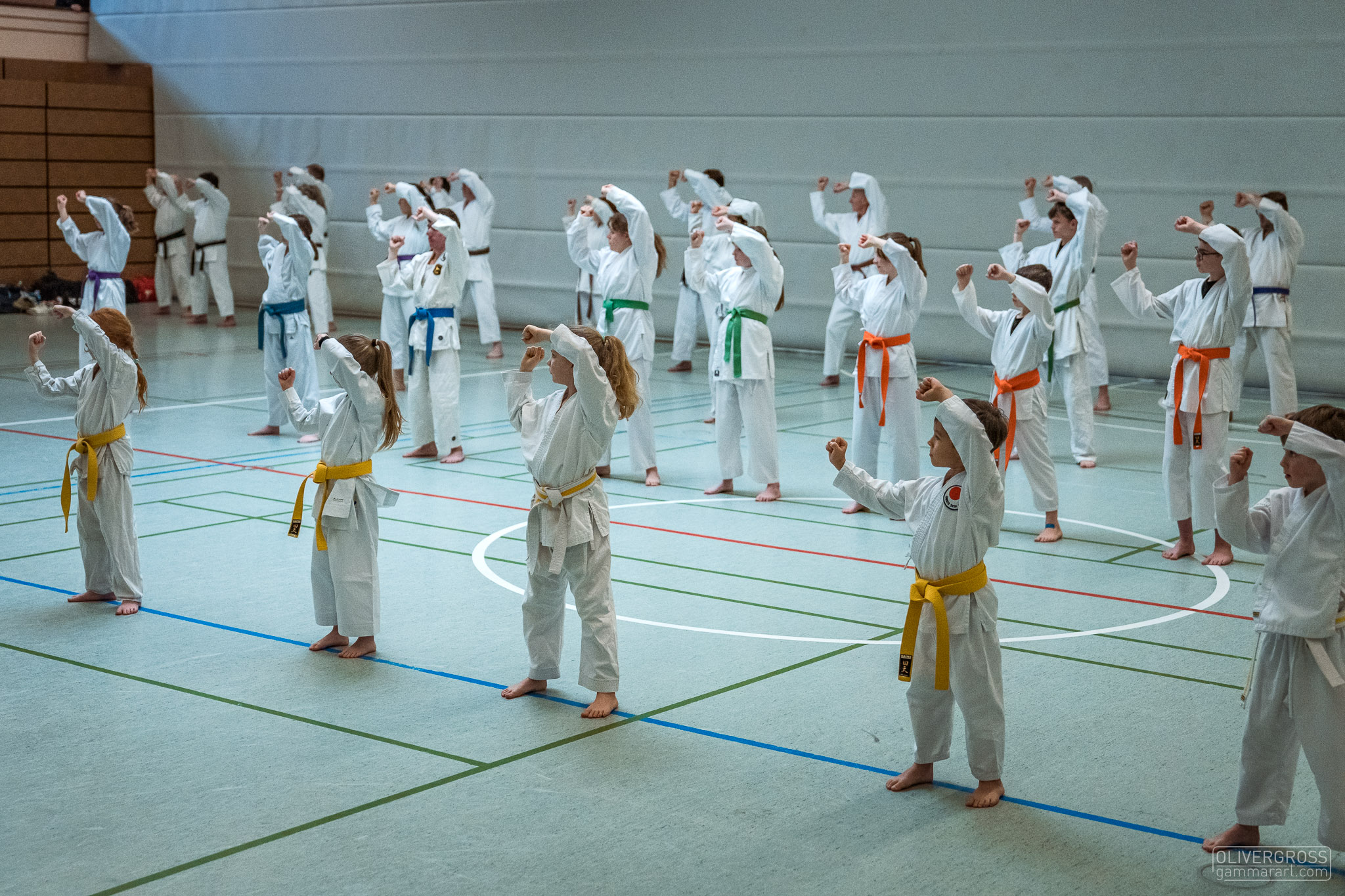 Alle trainieren Manji Uke im Karate Grundlagentraining – ohne Hacken sondern mit Harmonie.
