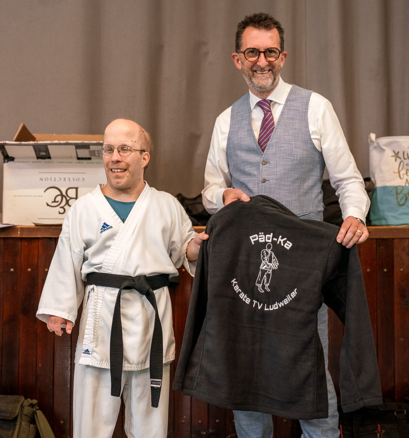 Päd-Ka Sebastian Harder und Minister Reinhold Jost präsentieren stolz die neuen Fleecejacken.