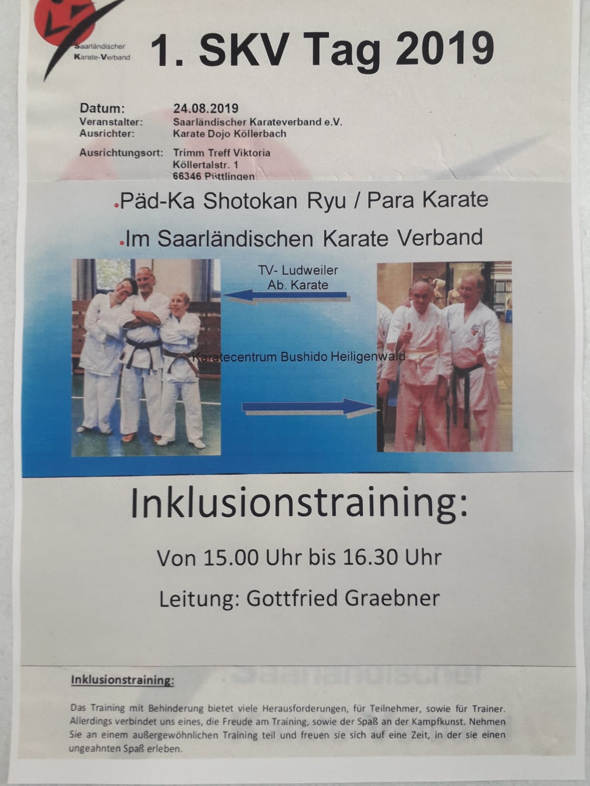 Im Rahmen des 1. SKV Tages findet am 24.08.2019 vor Ort auch ein Inklusionstraining statt. Gottfried Graebner hat unsere Päd-Ka Abteilung in den letzten Jahren immer weiter aufgebaut