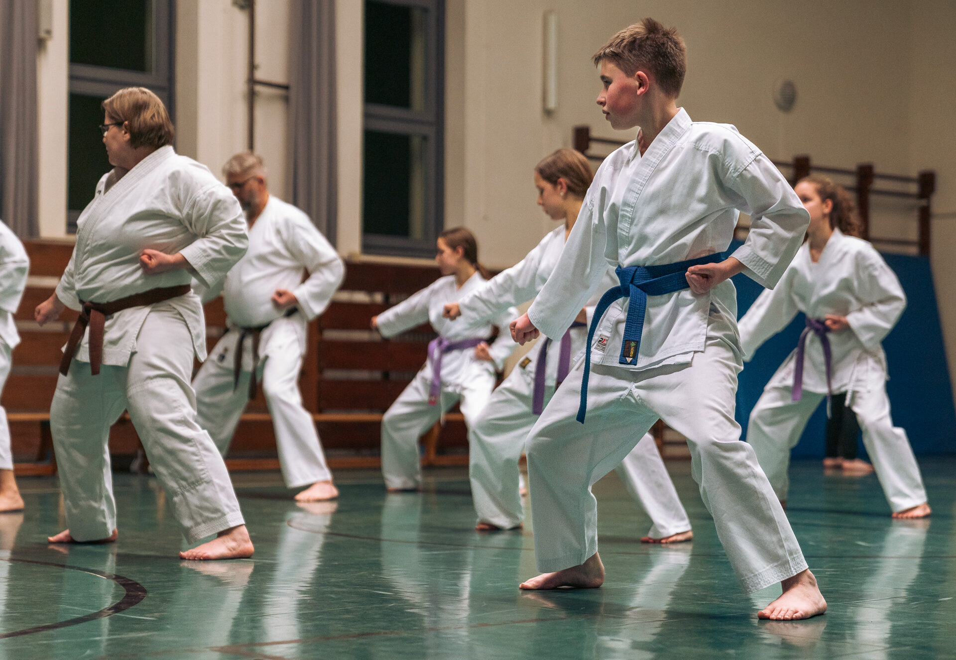Alle trainieren Manji Uke im Karate Grundlagentraining – ohne Hacken sondern mit Harmonie.