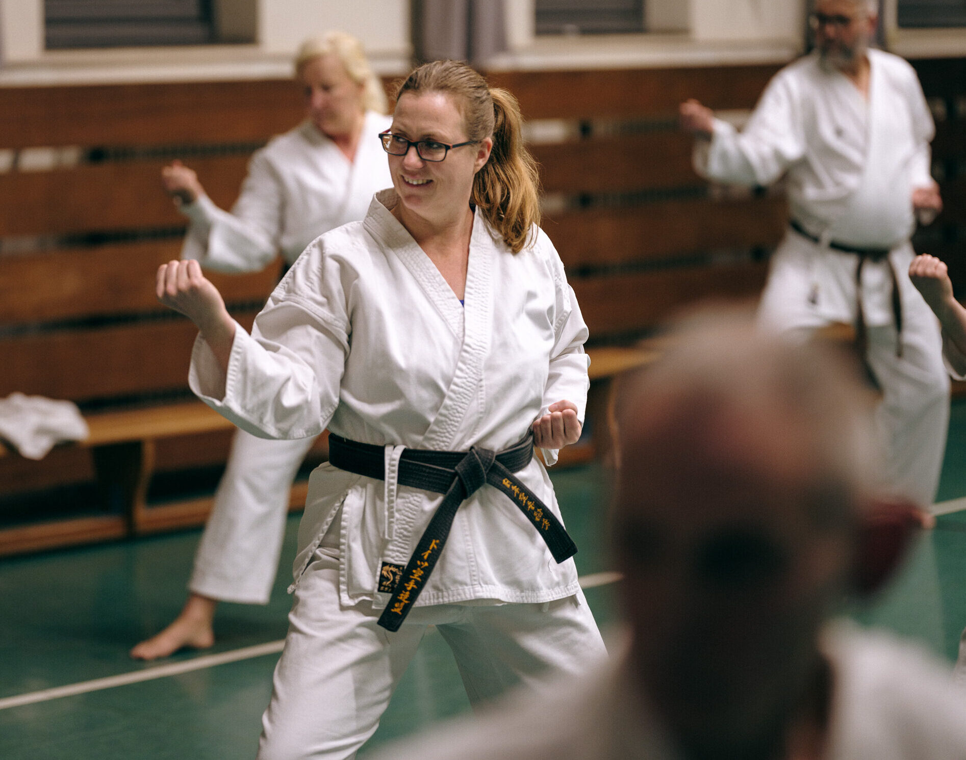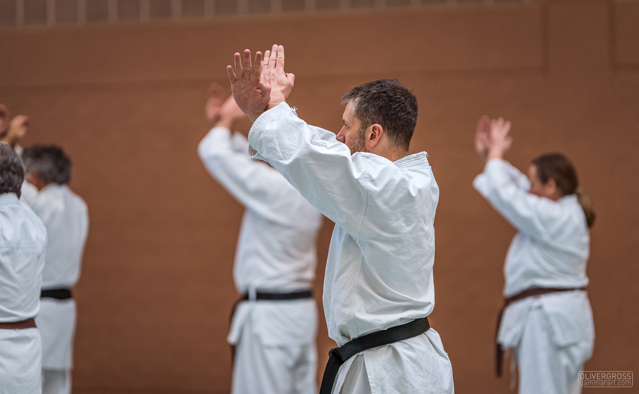 Alle trainieren Manji Uke im Karate Grundlagentraining – ohne Hacken sondern mit Harmonie.